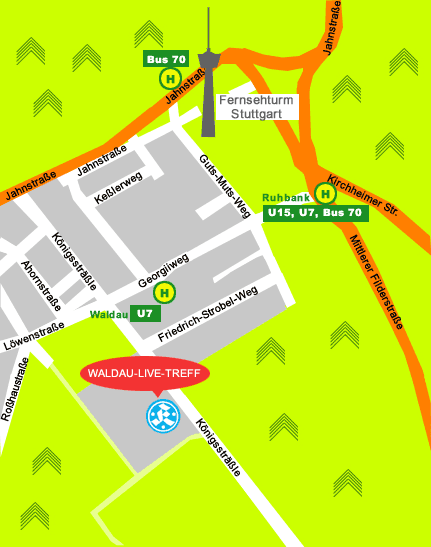 persönlicher Fahrplan Von der Innenstadt über die Weinsteige nach Degerloch. Immer Richtung Fernsehturm und dann rechts abbiegen ins Königsträßle. Der ADM-Sportpark befindet sich am Ende des Königsträßles .Von der Autobahn (A8) kommend, Ausfahrt Stuttgart-Degerloch / Möhringen, in Richtung Stuttgart einordnen. Auf der Bundesstraße 27 (B27) in Richtung Stuttgart-Degerloch. In Degerloch auf die "Jahnstraße" Richtung Fernsehturm / Gazi-Stadion abbiegen. Nach rund einem Kilometer rechts abbiegen ins Königsträßle.